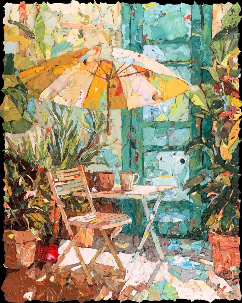 In my artwork, I seek to explore limits and barriers, and test the fragmentation of forms and the luminosity of colours (values and tones). Surveillance, appearance and camouflage are themes in my practice. My paintings become interactive in the sense that the coloured matter and its tactile aspect are a direct channel to the public; as a result, taking a step back will allow viewers to better observe the subject at a distance. Shifting, dissolution of reference points and reconstruction: this is the visual dialogue that challenges me in my practice.