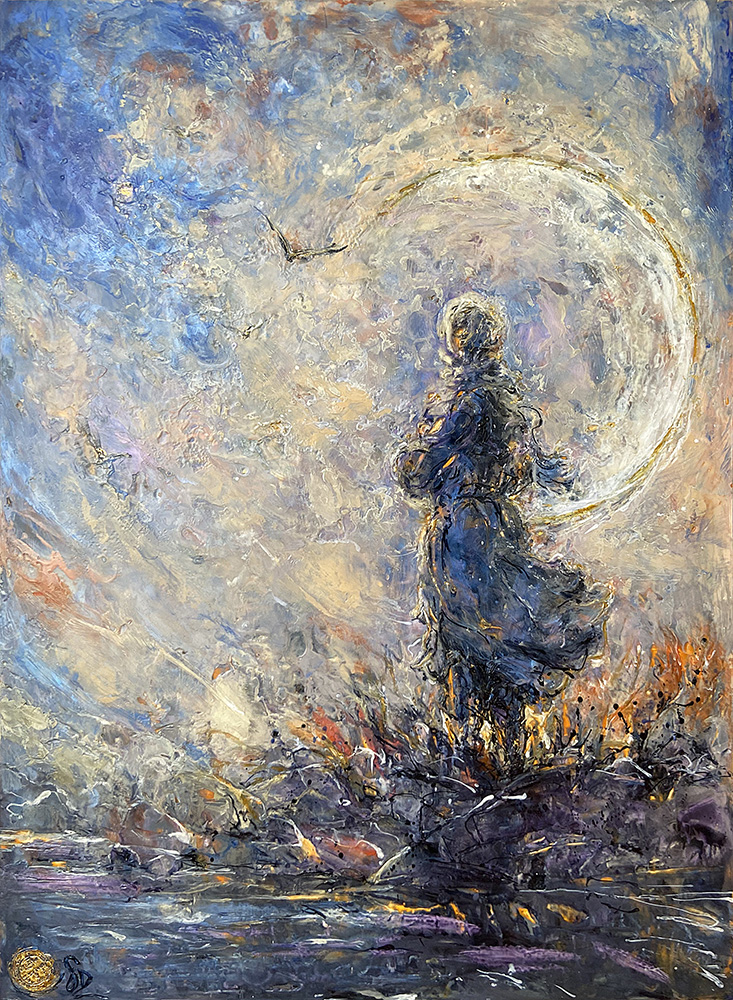 At daybreak, a lone figure faces the wind, encircled by a luminous crescent. Rich impasto and sweeping gestures suggest the breeze lifting her dress, while warm gold accents cut through violets and blues. Below, brambled rocks glow and water mirrors the first light. True to Gabrielle Dumont’s universe, the scene blends poetry and inwardness—the “brise du réveil” becomes a metaphor for renewal, momentum, and gentleness.