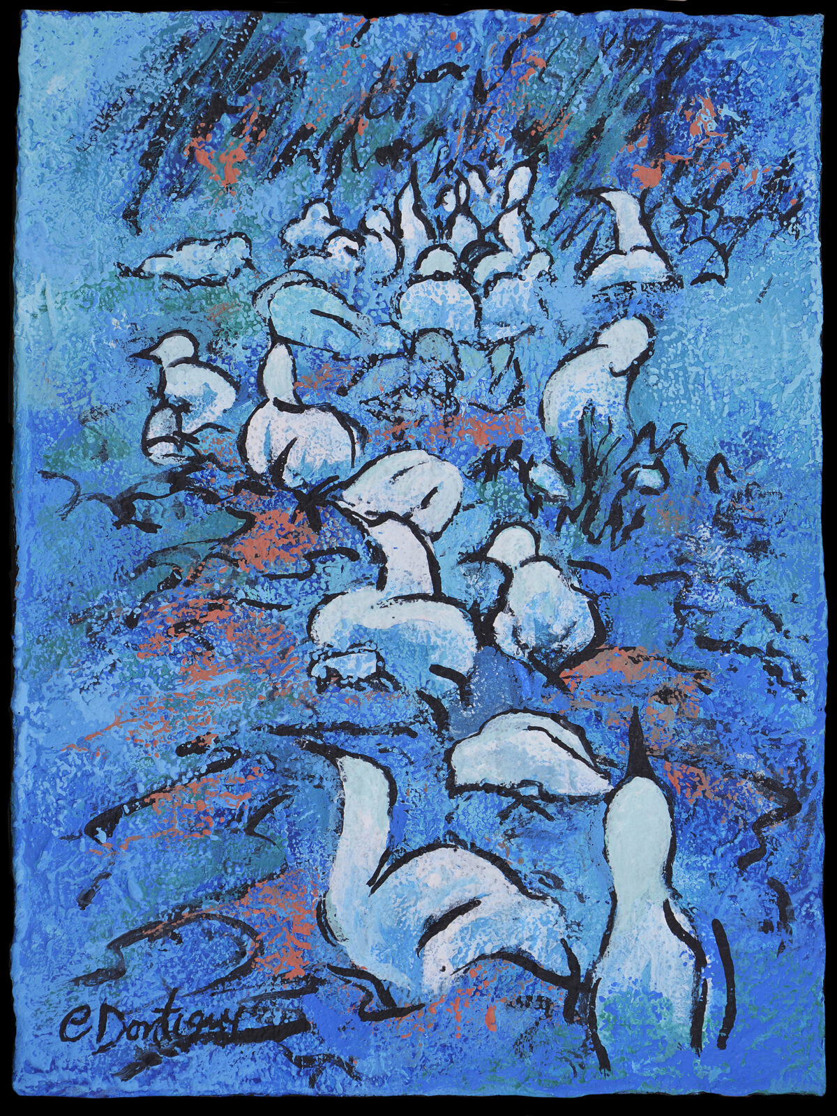 A vertical procession of Northern Gannets moves through a blue corridor of sea. Deep blues flecked with coral shimmer around bold, calligraphic lines that shape the flock’s pause and lift. The upright composition evokes the migratory route and the ocean’s pull.
