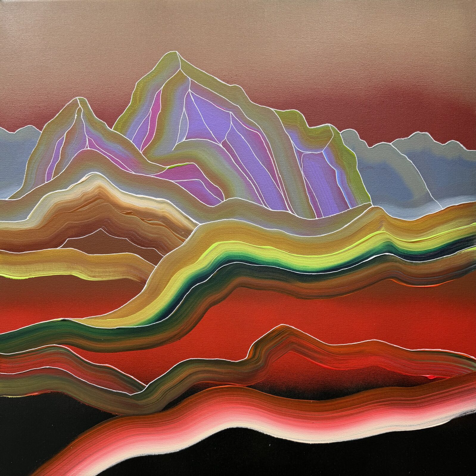 In Mountain cut, Jessie Bélisle treats the mountain as a living, emotional terrain. The landscape appears carved into layered bands of color, revealing inner depths and geological rhythms. Flowing lines, highlighted by light contours, lead the eye through successive planes, suggesting time, transformation, and the memory held within the land.