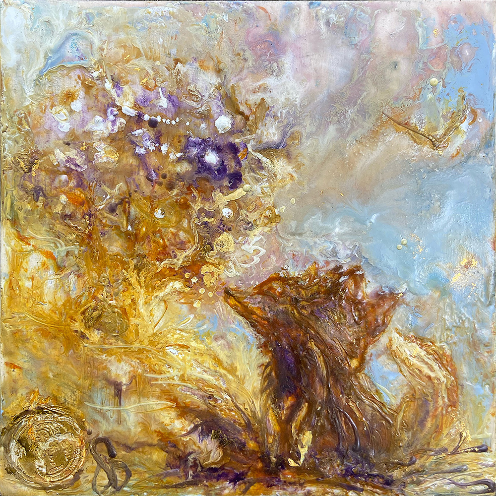 In this 8 x 8, Gabrielle Dumont’s encaustic swirls of gold, amber, and violet reveal a fox breathing life into a radiant tree. Layered reliefs catch the light, gold leaf shimmers like a rite of passage, and the piece suggests our own growth—mirroring his—in the warmth of wax and time.