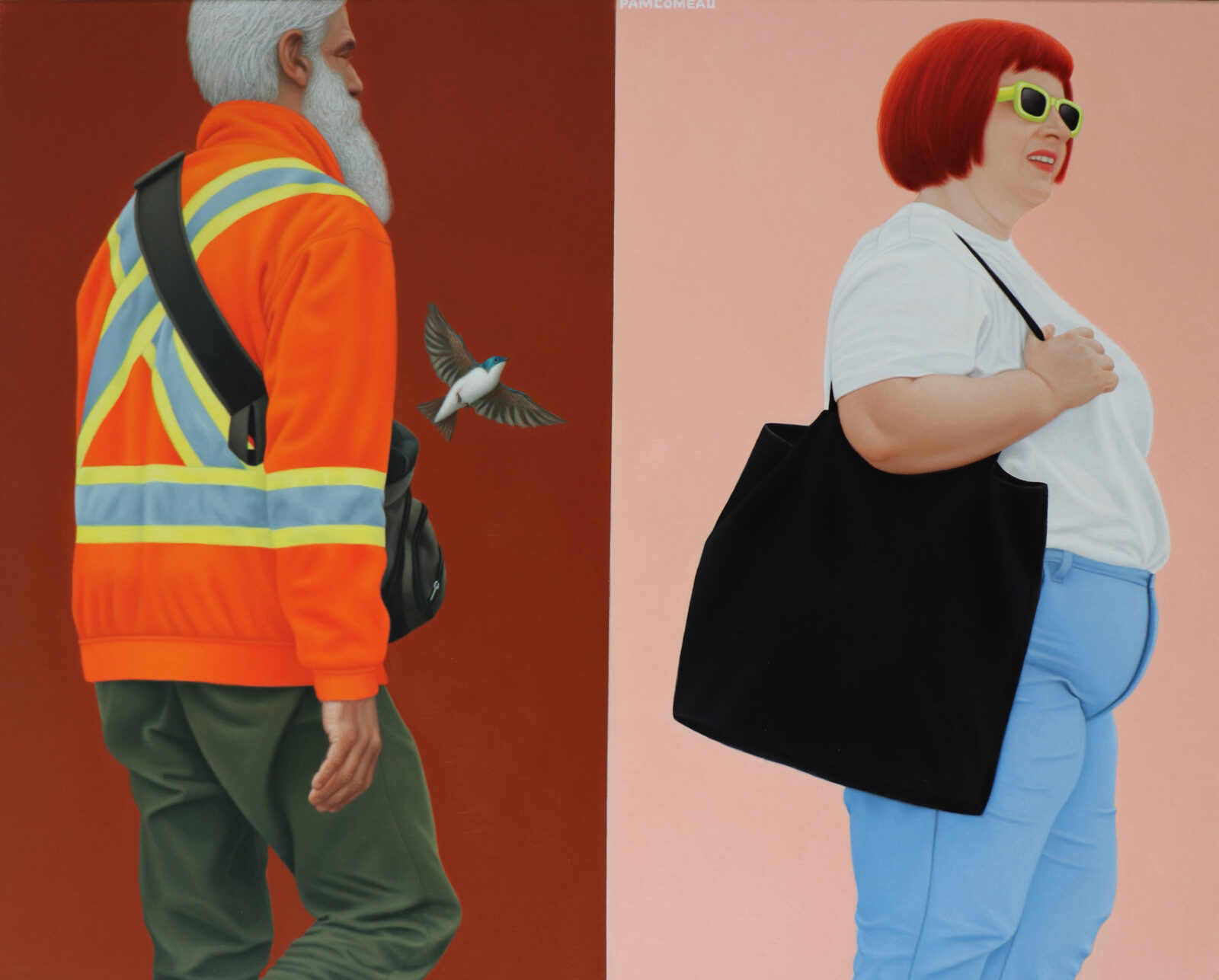 Two figures face each other against red and pink fields: a passerby in a safety jacket, a woman in bright sunglasses, and a bird mid-flight.