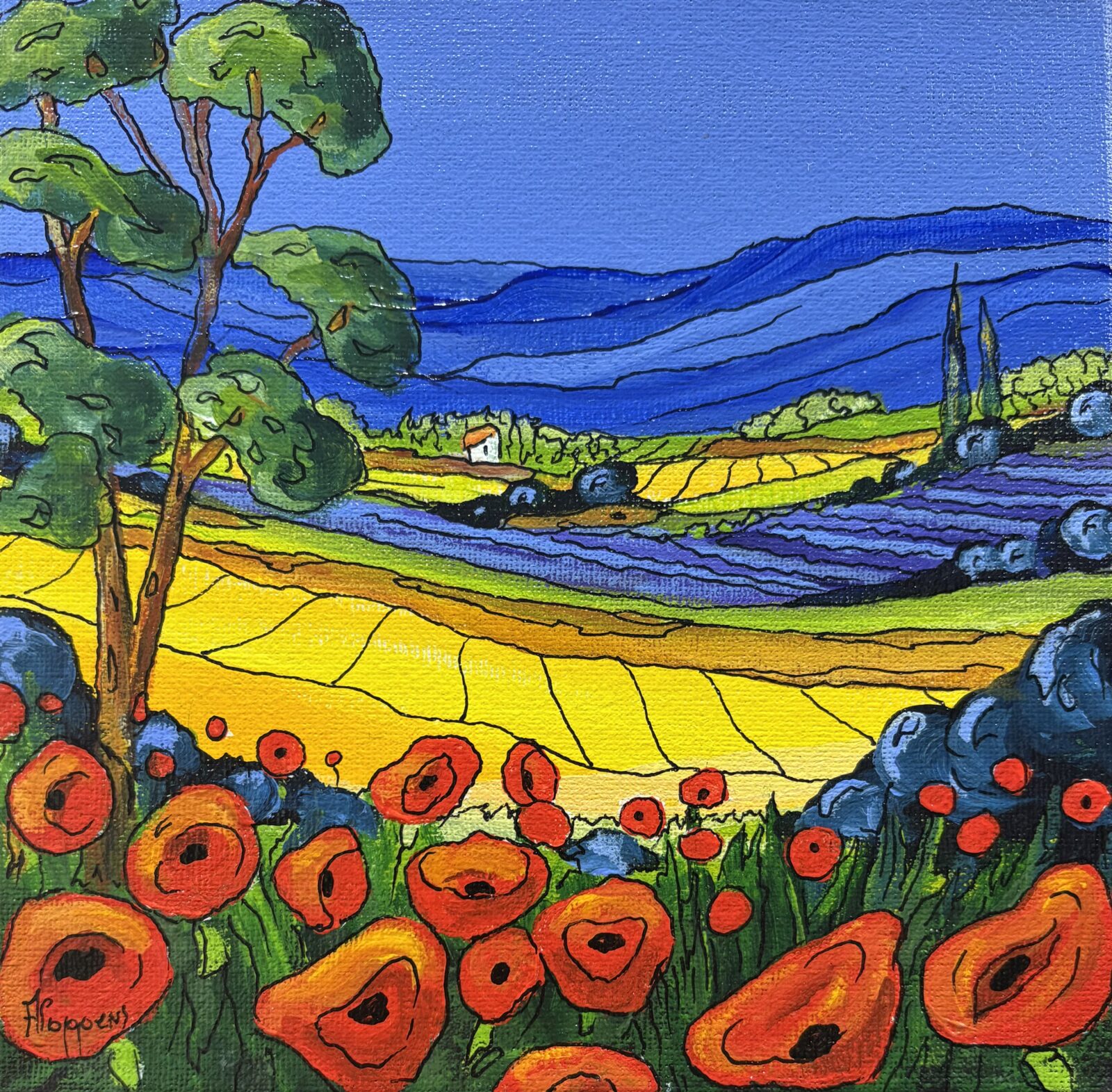 A blaze of poppies anchors the foreground as ribbons of golden fields and lavender roll toward distant blue hills. Bold contours and upright cypresses create rhythm and depth—a sunlit scene of quiet joy.