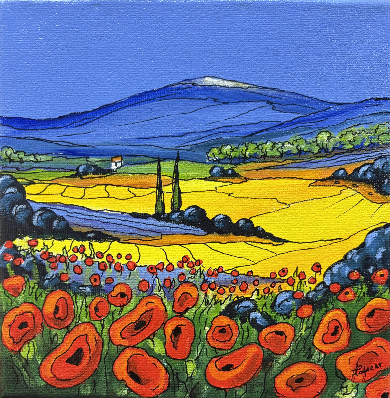 Beneath a vivid azure sky, poppies spill into golden fields punctuated by slender cypresses. Bold black contours organize each plane, drawing the eye toward layered blue hills and a distant farmhouse. The bright palette and decisive linework evoke a sunlit Provençal rhythm—warm earth balanced by a cooling horizon.