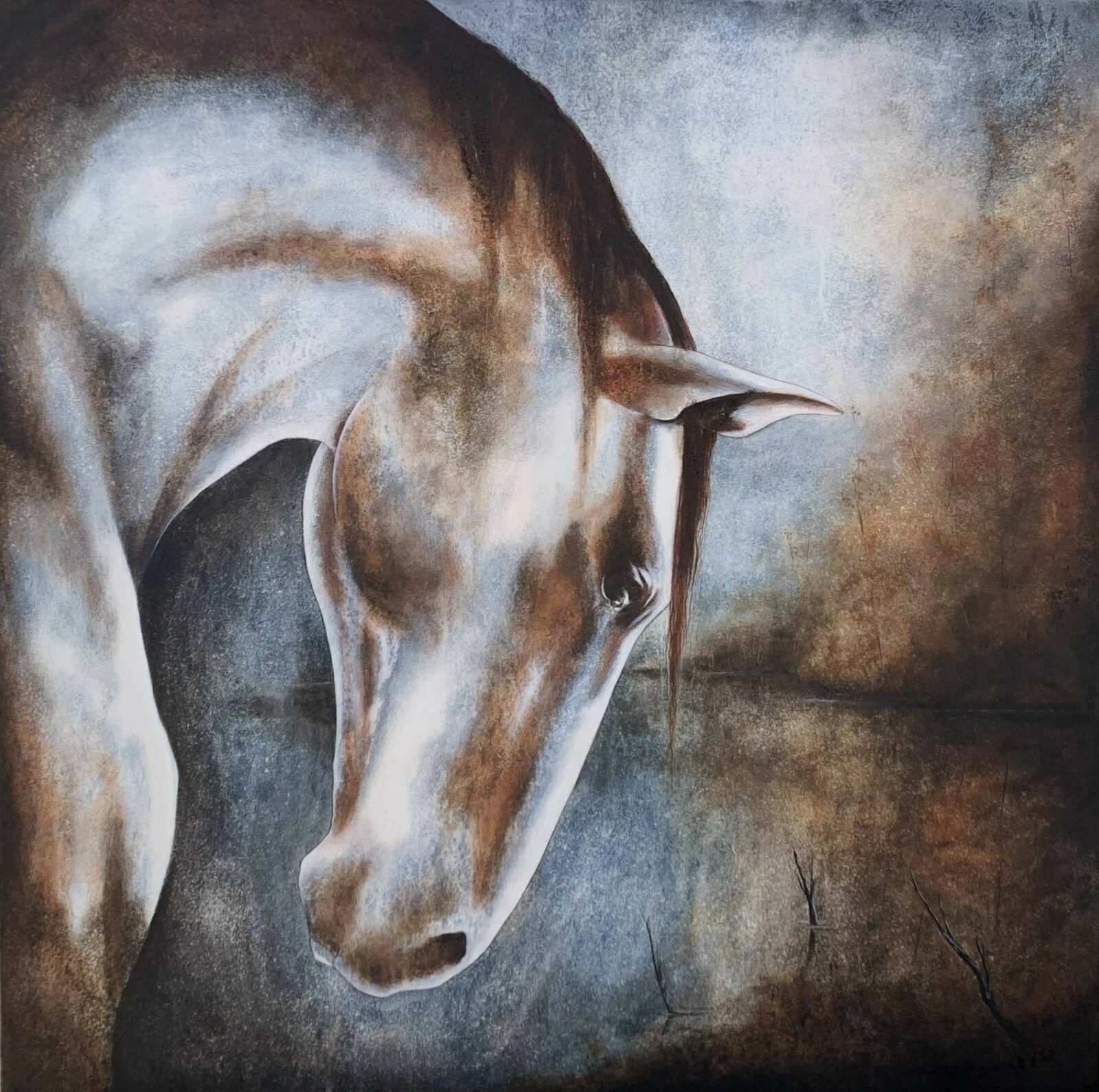 Silence Habité, acrylic and bauxite on canvas, 30 x 30 in. A bowed equine profile emerges in soft light; mineral pigments (bauxite) create earthy, velvety textures—hallmarks of Sophie Lebeuf. Warm–cool transitions model the anatomy while the textured ground suggests a quiet, contemplative space. Poised grace and inward strength.