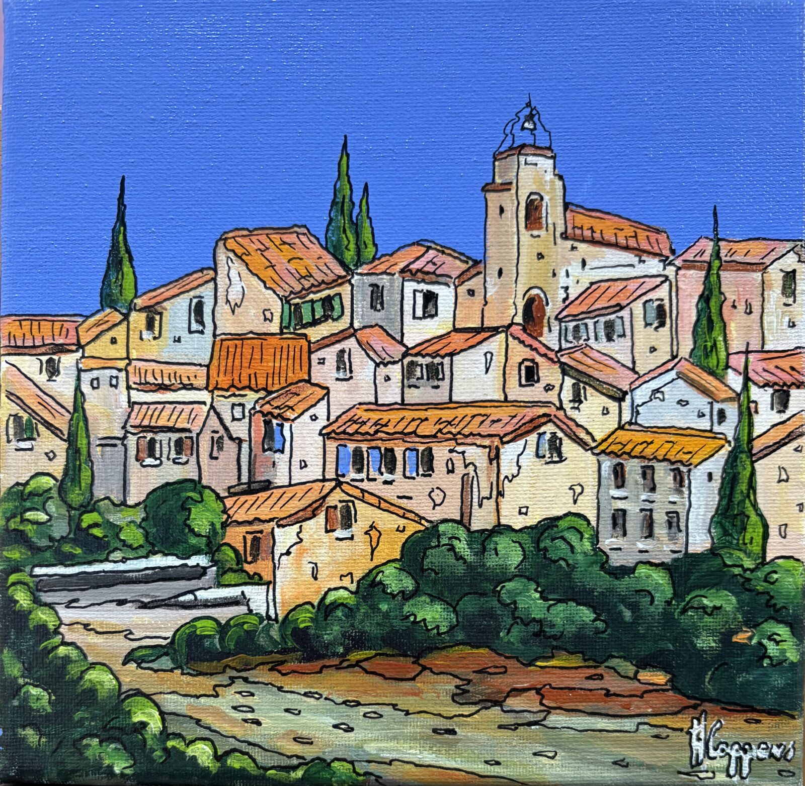 Stone houses cluster on a rocky spur; terracotta roofs, slender cypresses and a watchful bell tower define the skyline. Bold black contours animate walls and steps, while a stream in front grounds the view. Sunlit Provence distilled into structure, texture and warmth.