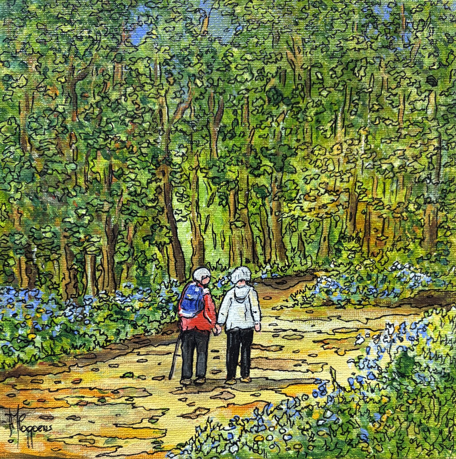 Sous la voûte d’un sous-bois lumineux, deux marcheurs avancent main dans la main le long d’un sentier ocre bordé de fleurs bleues. Les contours noirs et les aplats vibrants d’André Coppens animent feuillages et écorces, tandis que les verts superposés instaurent profondeur et quiétude. Une ode à la complicité et au calme des promenades en nature.