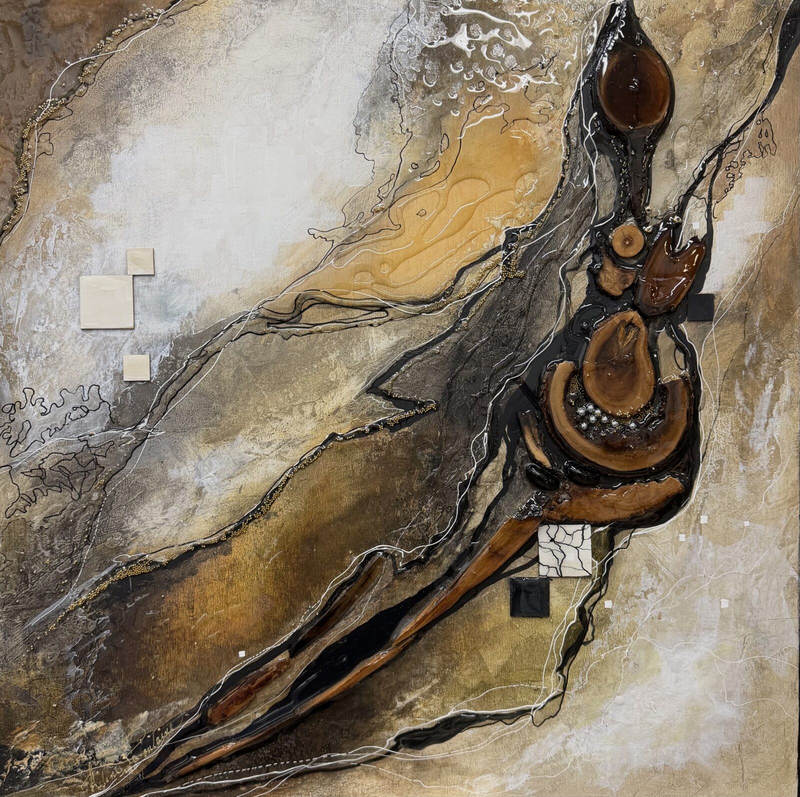Fusion tellurique explore le lien profond entre la matière, la terre et le mouvement intérieur. Dans cette œuvre en technique mixte sur bois, Hélène Lafontaine intègre des fragments naturels — bois polis par le temps et l’eau — qui s’ancrent dans la composition comme des vestiges géologiques. Les lignes fluides et contrastées évoquent des failles, des courants souterrains et des forces invisibles en perpétuelle transformation.
